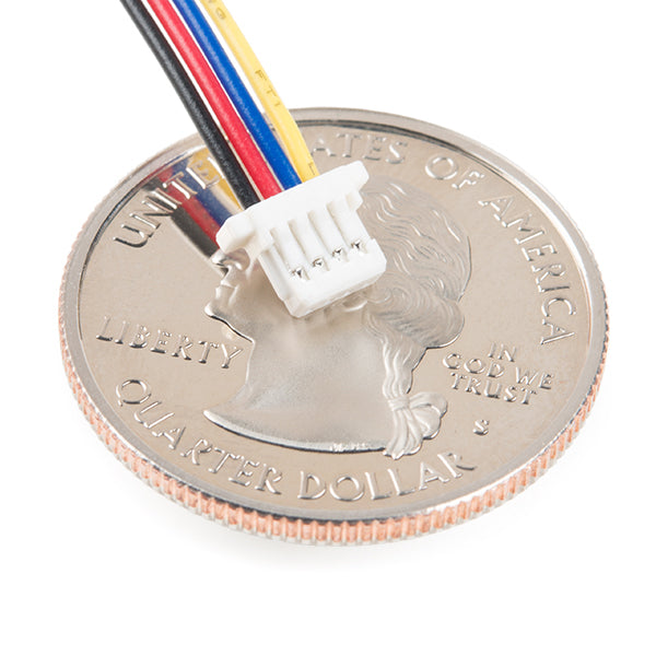 El cable 28 AWG tiene una longitud de 150 mm (aproximadamente 5.9 pulgadas). Los cables del adaptador están codificados por colores: rojo, negro, azul y amarillo. Además, el conector hembra Qwiic tiene un paso básico de 1 mm, mientras que los pines macho se pueden insertar fácilmente en un conector estándar de 0.1".