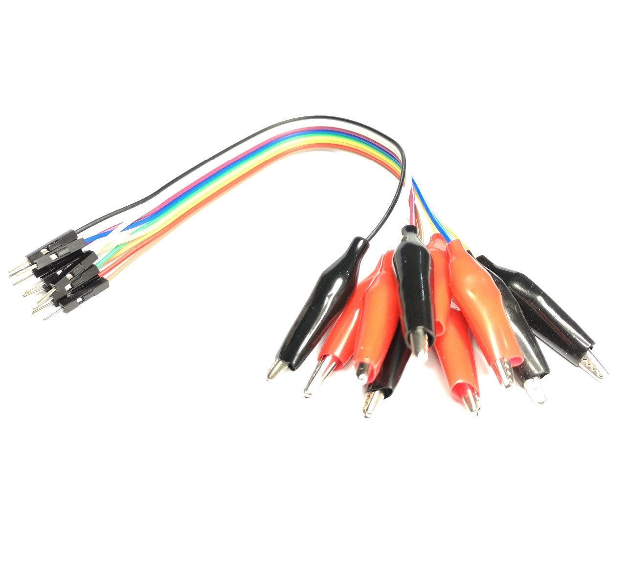 Este es un paquete de 10 cables que están pre-terminados con una pinza de cocodrilo en un extremo y un pin dupont de conexión en el otro. Las pinzas de cocodrilo son una pieza básica para cualquier banco de trabajo y con estos cables podrá incorporar fácilmente esas pinzas en una placa de pruebas, plataforma de desarrollo o cualquier otra cosa a la que normalmente pueda conectar un cable de conexión.