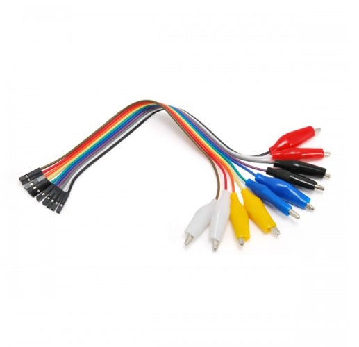 Este es un paquete de 10 cables que están preterminados con una pinza de cocodrilo en un extremo y un conector dupont hembra de conexión en el otro. Las pinzas de cocodrilo son un elemento básico para cualquier banco de trabajo o espacio de fabricación, y con estos cables podrá incorporar fácilmente esos clips en una placa de pruebas, plataforma de desarrollo o cualquier otra cosa a la que normalmente podría conectar un cable de conexión.