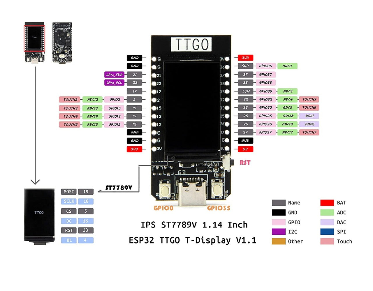 La LilyGO TTGO T-display ESP32 es una pequeña placa de desarrollo Arduino con pantalla a color, interfaz de carga de batería, 2 botones GPIO integrados y conector USB-C.