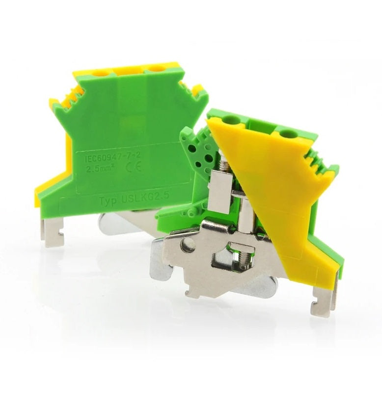 Estos son bloques de terminales de riel DIN de tornillo universal, modelo USLKG2.5, conocida como bornera de tierra, puesto que hace contacto electrico con el riel din y toda la estructura del panel donde vaya a colocarse, estan hechos con materiales de ingeniería de PC retardantes de llama de alta calidad, con excelente retardante de llama y resistencia al impacto, lo que fortalece su confiabilidad y seguridad.