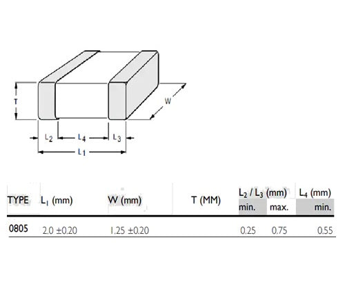 Este es un condensador SMD de uso muy común. Se utiliza para multiples para fines de carga. El encapsulado SMD es el tamaño 0805. Estos capacitores se utilizan comúnmente en PCB's y otras aplicaciones de creación de prototipos.